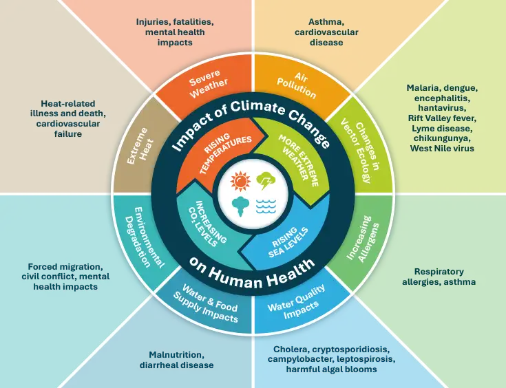 • Rising temperatures and heatwaves: contributing to heat-related illnesses including heat exhaustion and heatstroke